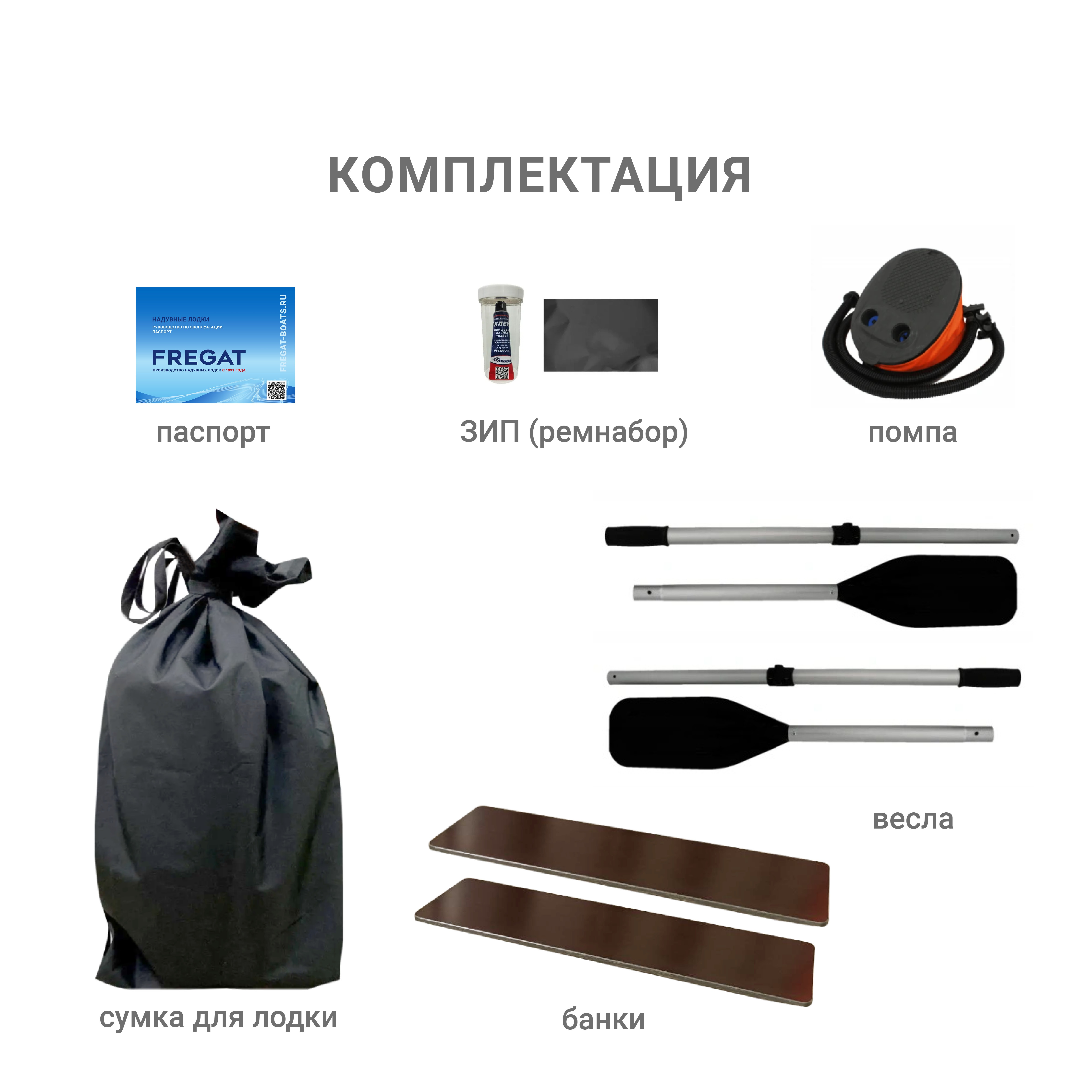 Лодка, весла, сумка-рюкзак, паспорт, ножная помпа (насос), ремкомплект. Упаковывается в удобную сумку-рюкзак и легко переносится одним человеком.