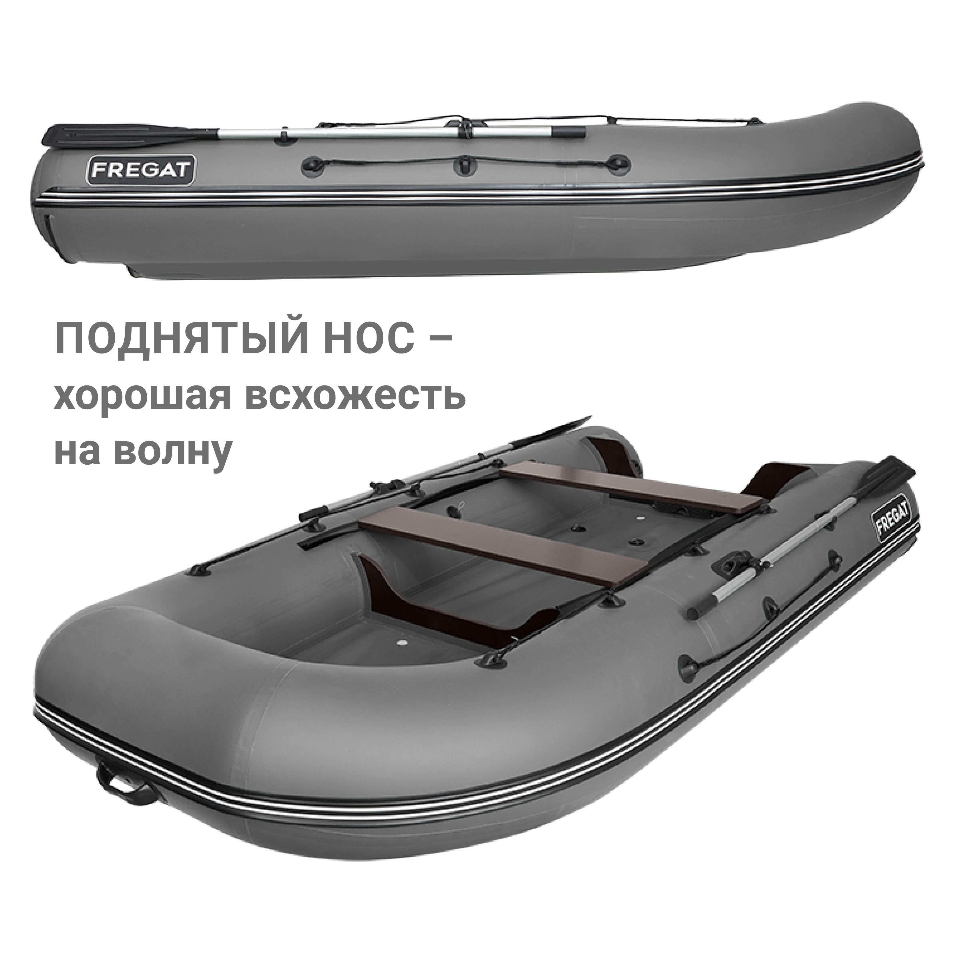 Общее для всех лодок класса FM — днище низкого давления из 3-х независимых продольных баллонов низкого давления, соединенных между собой. Такая конструкция дает продольную жесткость корпуса и поперечную жесткость днища (сопоставимую с жесткокорпусными судами) и, как следствие, высокие скоростные характеристики. Также благодаря днищу низкого давления у лодки Фрегат 350 FM Light.