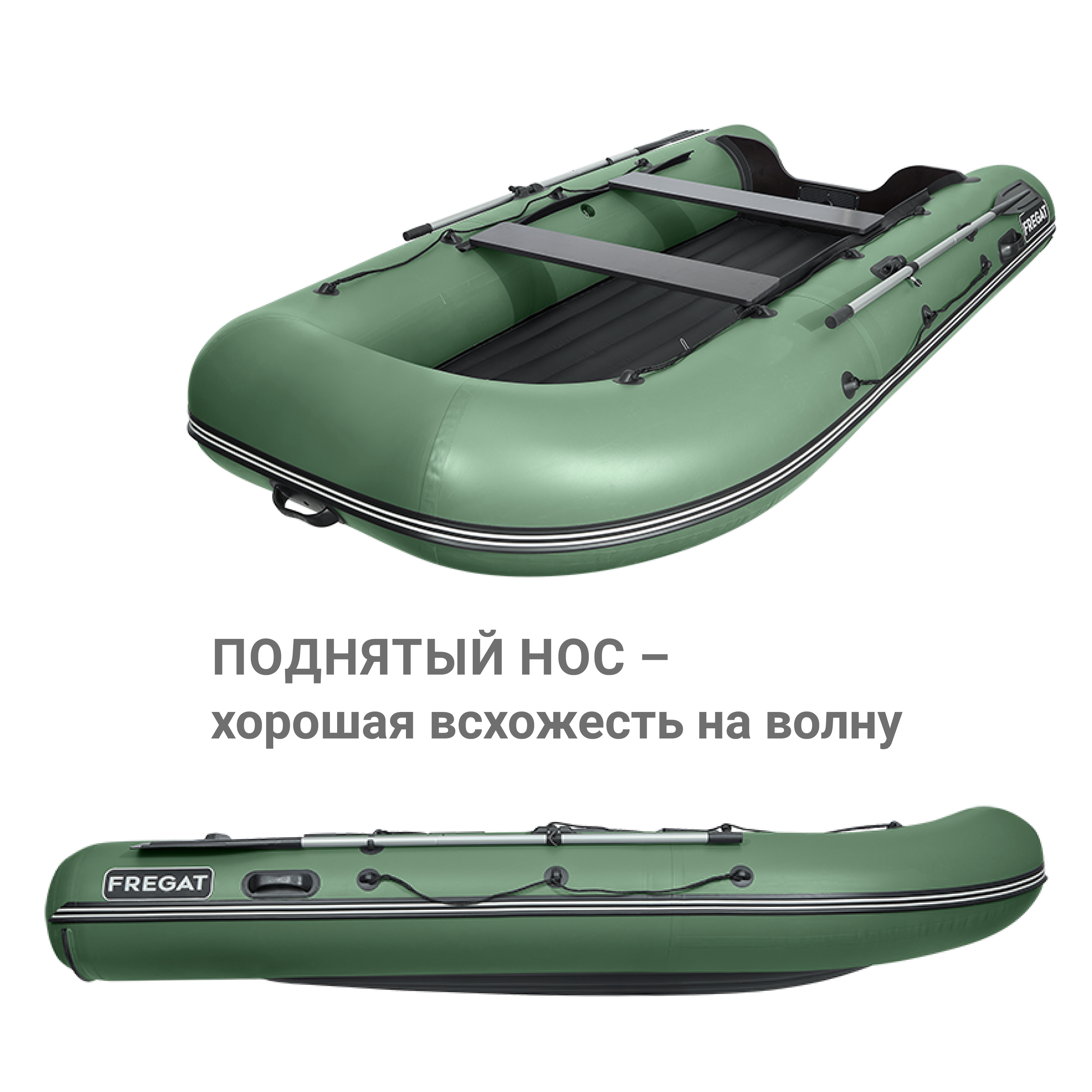 Фрегат 350 Air — это беспайольная моторная лодка ПВХ с надувным дном низкого давления, длиной 3,50 м под мотор до 15 л.с., рассчитанная на 5 пассажиров со снаряжением. Фрегат Air — серия надувных моторных лодок с НДНД, надежных и прочных, с отличной маневренностью и управляемостью. Они предназначены для рыбалки, охоты и активного отдыха на воде. Благодаря жестко вклеенному надувному килевому дну в лодках Фрегат Air отсутствует пайол из фанеры, в отличие от лодок серий EK, C, F, PRO. За счет этого лодки этой серии имеют значительно меньший вес при одинаковой длине. Подготовка лодки серии Air к спуску на воду занимает 10 минут, достаточно накачать отсеки до рабочего давления. Сборка такой лодки заключается в открытии клапанов и простом сворачивании в сумку.