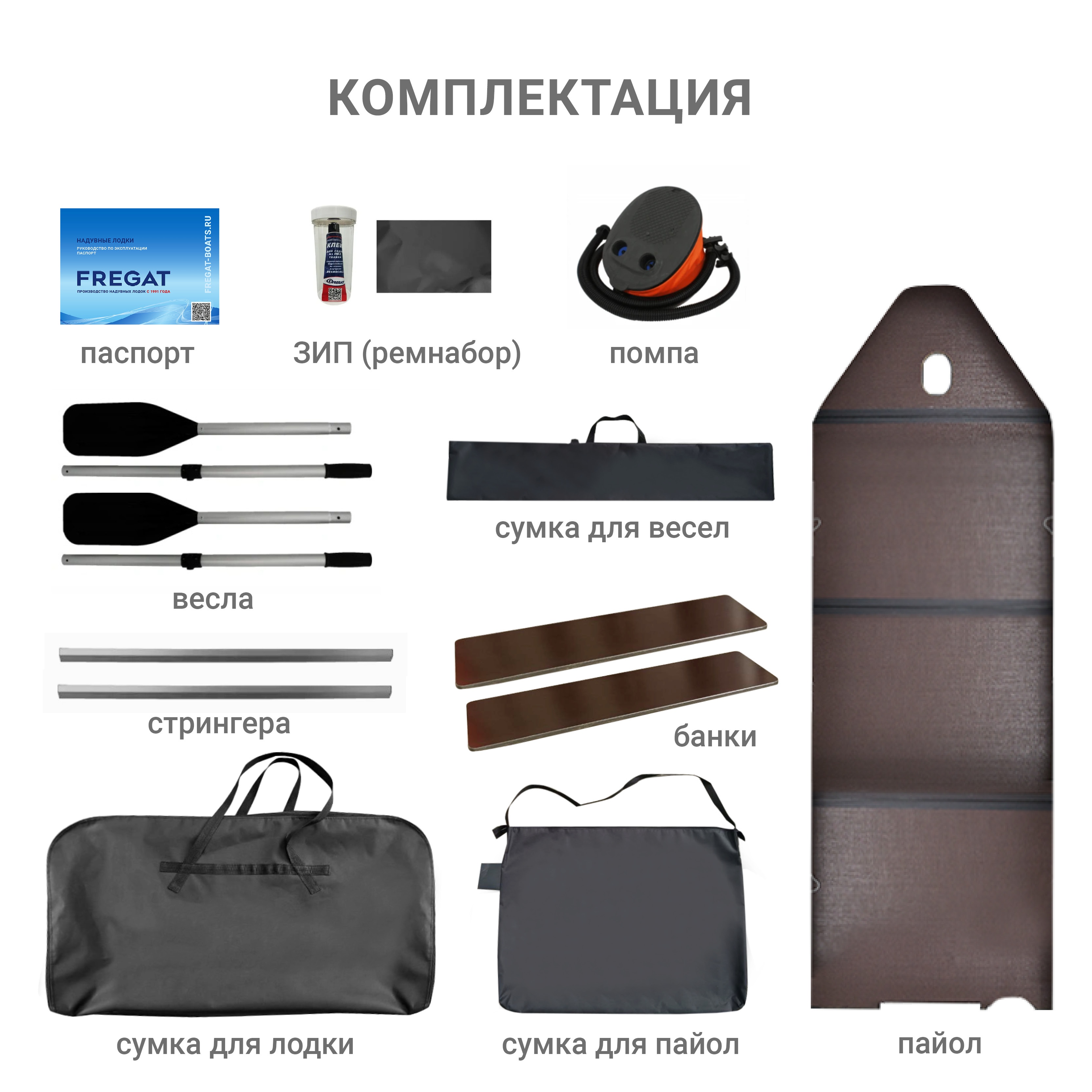 Лодка, весла, пайол, упаковочные сумки, паспорт, ножная помпа (насос), ремкомплект. Транспортировка проста и удобна — в сложенном состоянии лодка перевозится в двух упаковочных сумках.