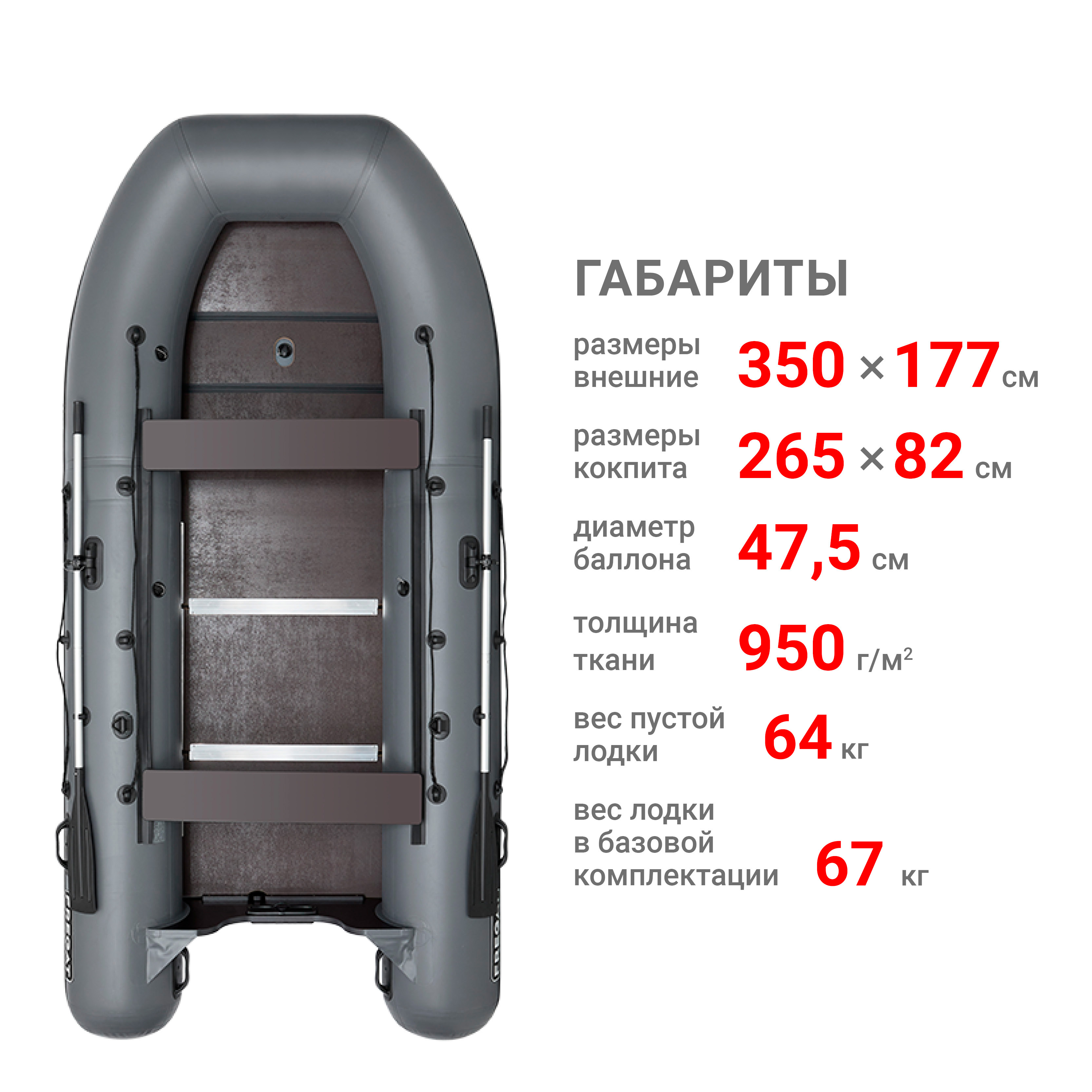 Лодка, весла, упаковочные сумки, паспорт, ножная помпа (насос), складной пайол, ремкомплект. В сложенном состоянии 350 С перевозится в двух упаковочных сумках плюс сумка-чехол с веслами и стрингерами.