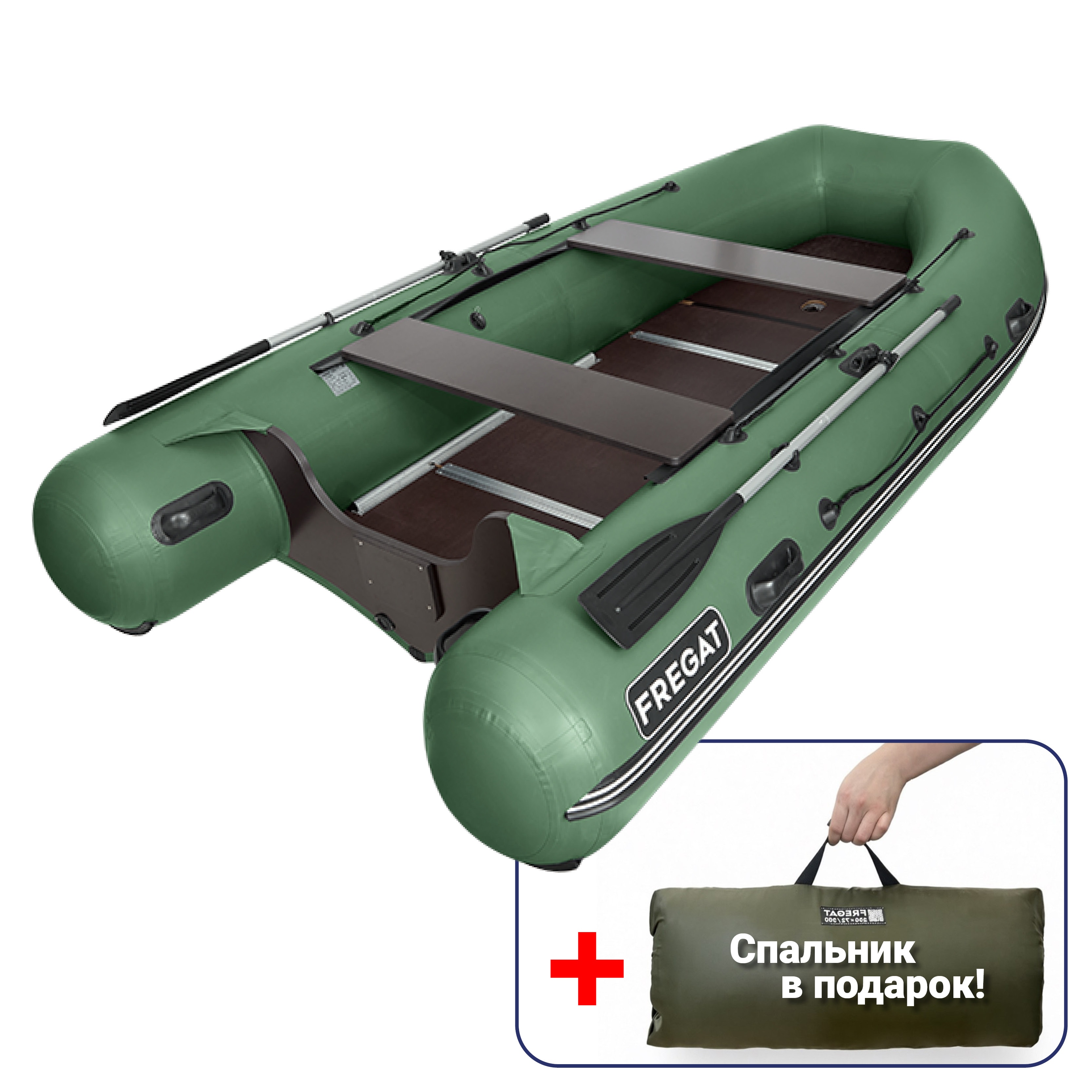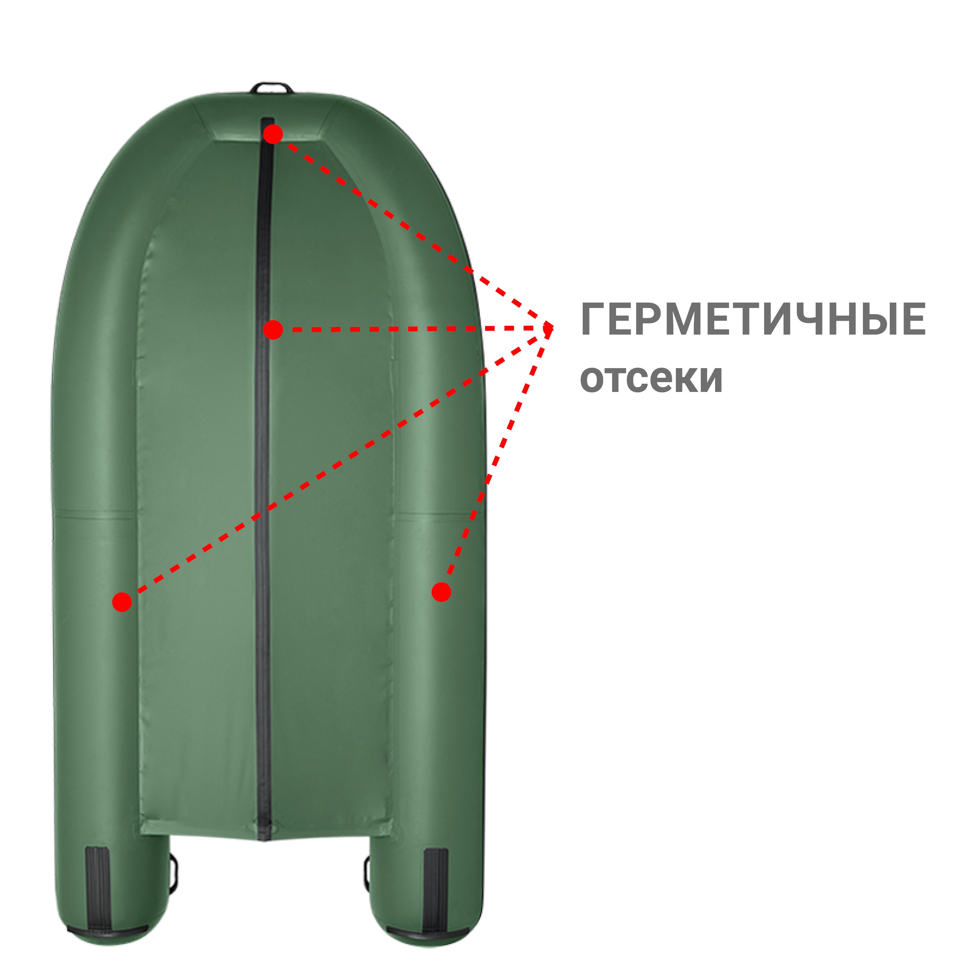 U-образный баллон с перегородками и вклеенным транцем Фрегат 430 С состоит из «U»-образного баллона, разделенного на 4 независимых отсека внутренними перегородками и замкнутого в корме вклеенным жестким транцем. Снизу к корпусу лодки приклеено днище и надувной киль. Перегородки баллона находятся под поворотными уключинами. Благодаря такой конструкции, даже в случае повреждения одного из отсеков, надувная лодка остается на плаву и сохраняется возможность эффективно работать веслами. По бортам расположен леерный пояс, обеспечивающий страховку пассажиров.