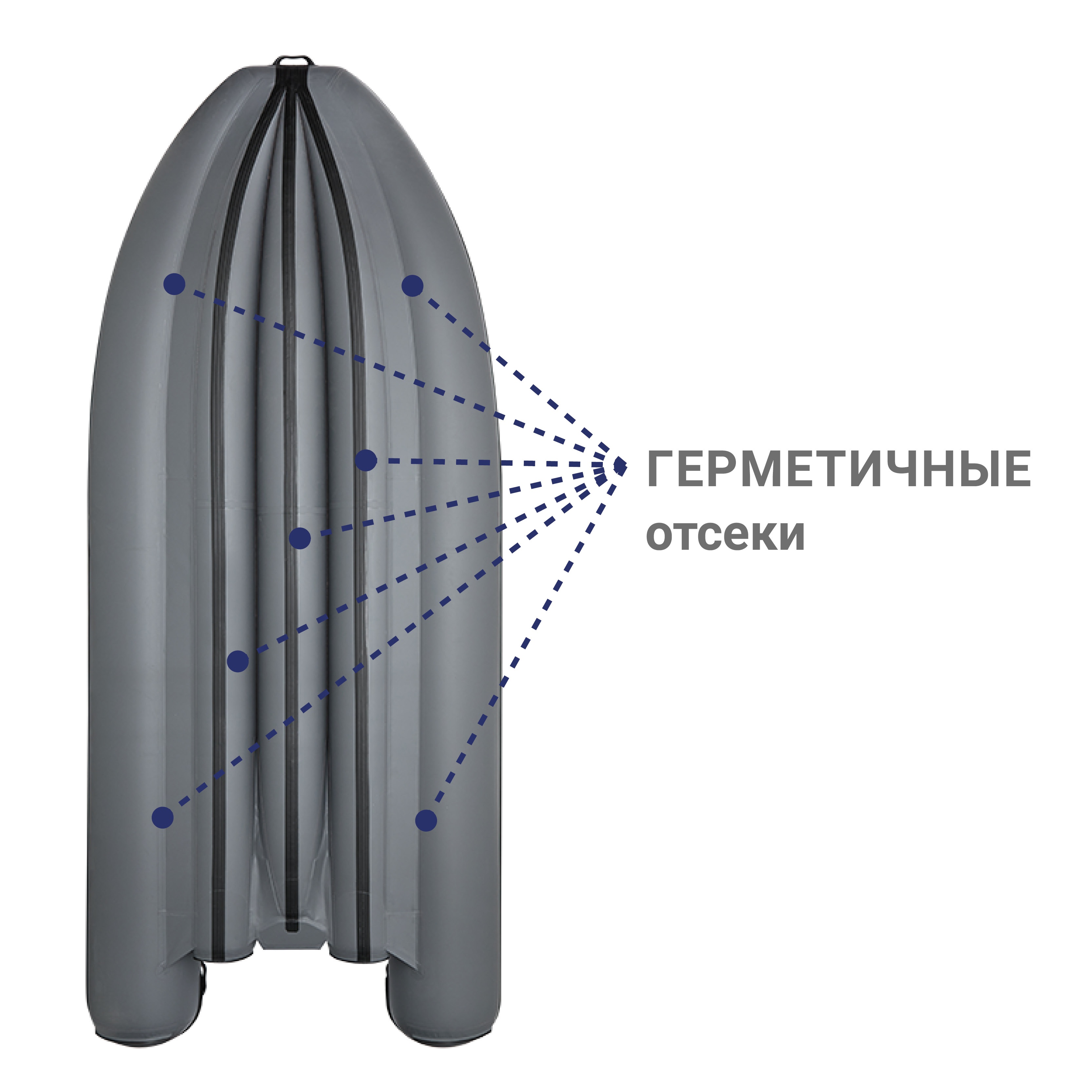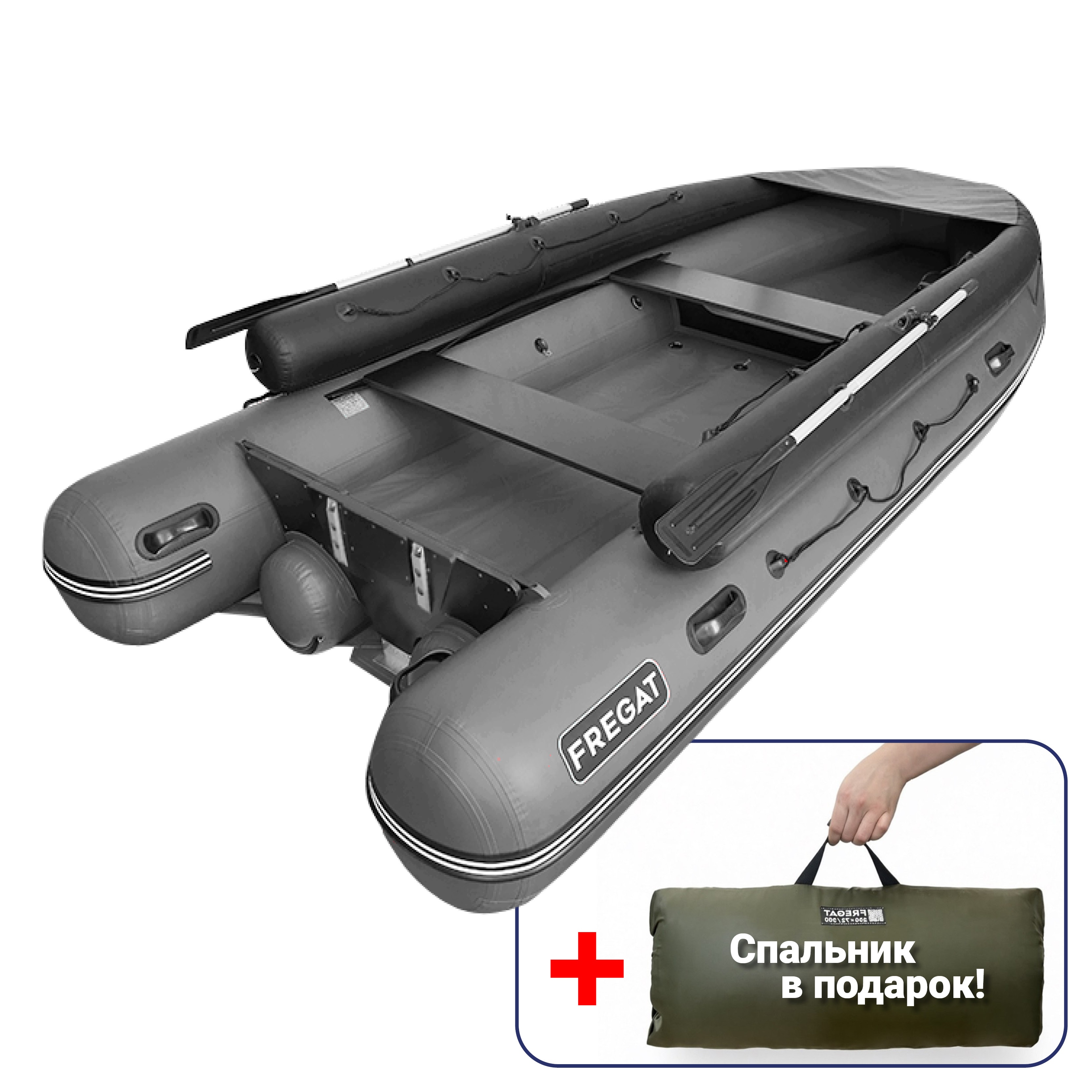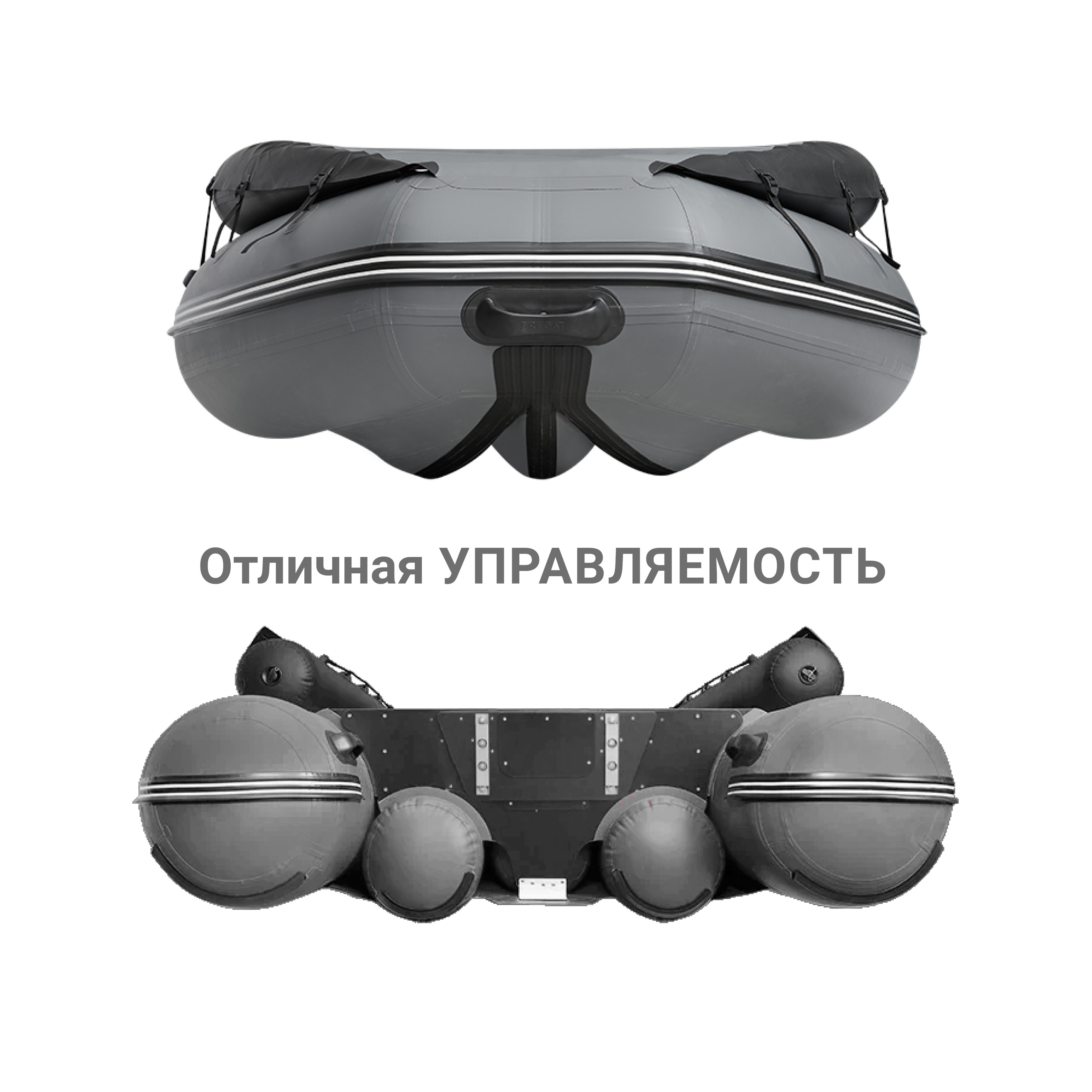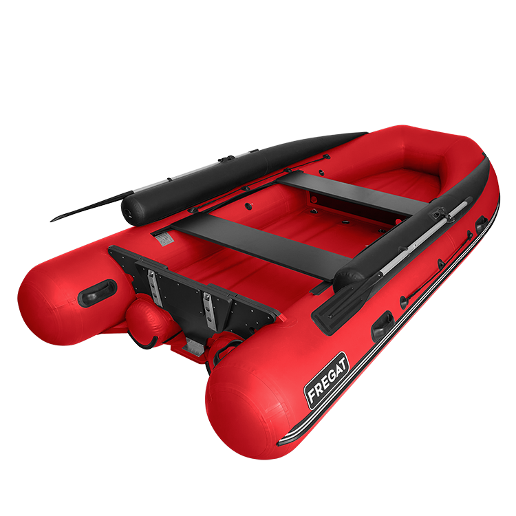 Дно надувной лодки Фрегат образуют 3 продольных баллона, приклеенных к самоотливной палубе, находящейся при полной загрузке лодки выше уровня воды. На корме и носу надувной лодки ПВХ установлены ручки, служащие для ее переноски в рабочем состоянии. Внутри кокпита и снаружи корпуса установлены леерные пояса, обеспечивающие страховку пассажирам.